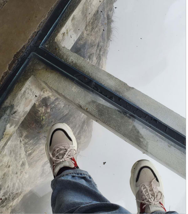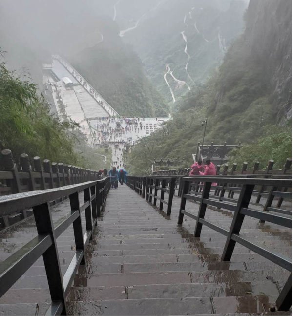 于是在我們又轉(zhuǎn)了7層電梯后,終于來(lái)到了天門(mén)洞上。依然是白茫茫的一片,天門(mén)山棧道,底下原本高聳陡峭的山崖,在白霧的襯托下,一點(diǎn)兒也不讓人覺(jué)得害怕了,只是雨天濕滑,內(nèi)心在默默祈禱千萬(wàn)不要摔倒就好。