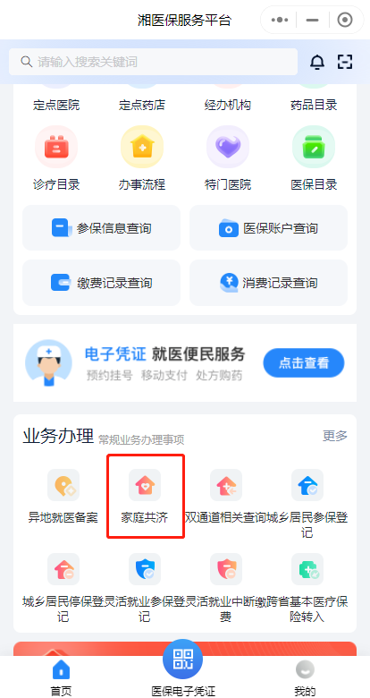 第一步:下載“湘醫(yī)?!盇pp,或進(jìn)入“湘醫(yī)?!盇pp小程序,登錄后在首頁(yè)“業(yè)務(wù)辦理”中找到“家庭共濟(jì)”,點(diǎn)擊“共濟(jì)申請(qǐng)”。